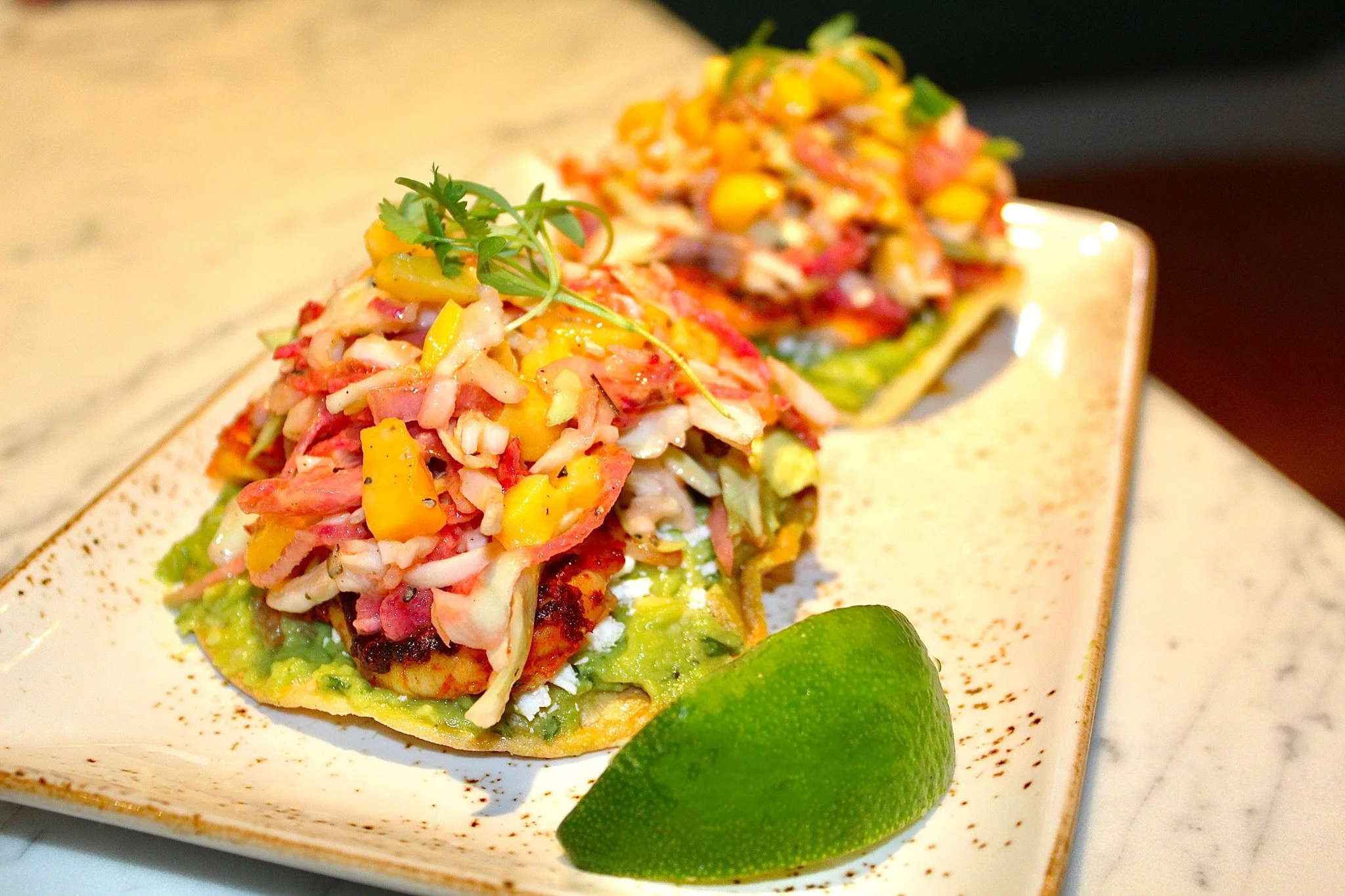 The Shrimp Tostada is made with shrimp, corn tostada, guacamole, cotija, & slaw.